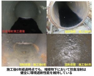 次回の定期内部検査でも同部位に新たな深刻腐食は認められず、腐食の再発防止と設備寿命の延長に大きく貢献しています。実際、海外の類似事例でも従来の有機ライニングを溶射合金皮膜に置き換えたデソルターにおいて、4年後の検査時点でも溶射皮膜に厚み減少が全く見られなかったと報告されています。