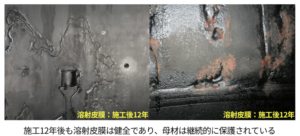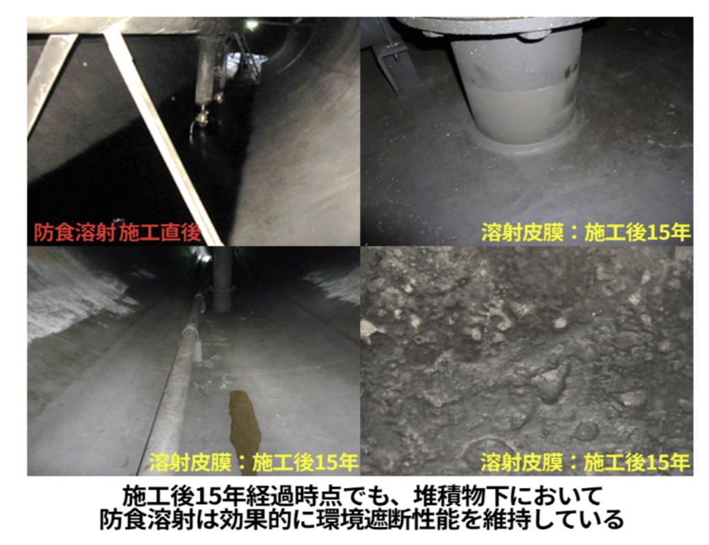 溶射されたアルミ皮膜が鋼板を覆って腐食環境との接触を断ち、さらにアルミニウムの犠牲防食効果(鋼より先に溶解して腐食を防ぐ作用)も期待できるため、施工後は底部における腐食進行が明らかに抑制されました。